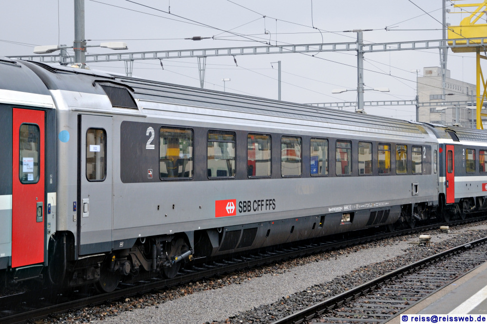 Die vorübergehend im Cisalpino-Verkehr eingesetzten EC-Wagen verlieren allmählich ihre blauen Streifen und erhalten SBB-Signete, wie hier der im EC „Transalpin“ eingereihte Bpm 61 85 20-90 326 (Zürich HB, 12.12.2009).