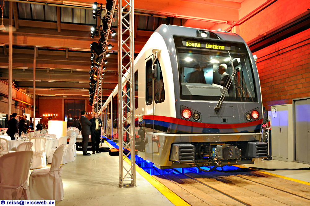 | Der erste „Diamant“ ABe 4/8 5001 nach der offiziellen Enthüllung in der Wagenhalle in Bremgarten. Als geladener Gast (Presse) werde ich nie vergessen, daß der gesamte Ablauf der Veranstaltung komplett umgeschmissen wurde, weil der Caterer vergessen hatte, einen Großteil der Teller und Gläser aus dem Auto zu nehmen (16.12.2009). |