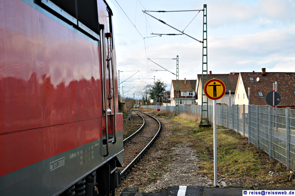 | Eine am Schienenstrang befestigte SH-2-Scheibe verhindert in Neuenburg wegen Baurbeiten die Weiterfahrt nach Frankreich. Für 111 048 wäre ohnehin Endstation, mit 25kV/50 Hz (französisches Stromsystem) käme sie nicht zurecht. Eine SNCF-Baureihe, die den Systemwechsel bewältigen kann, siehe hier (31.12.2009). |