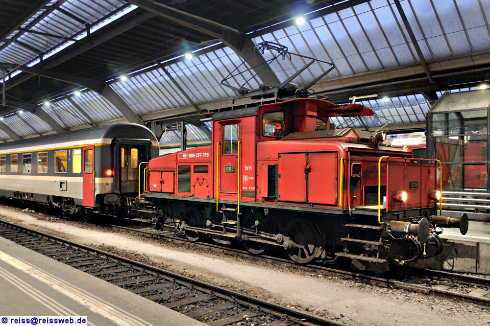 Ee 3/3 16358 hat soeben eine EC-Garnitur an den Bahnsteig gestellt, entkuppelt und einige Meter vorgezogen, während an der Zugspitze die Zuglok angekuppelt wird (Zürich HB, 17.02.2010).