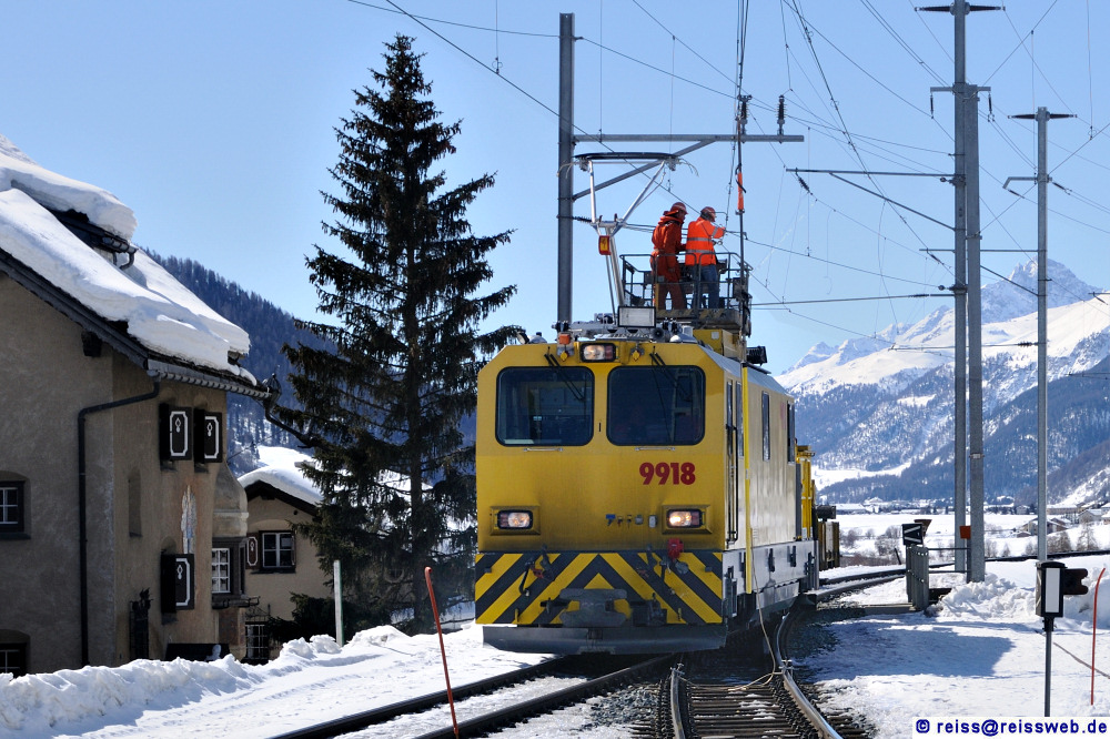 Der Fahrleitungstriebwagen Xmf 4/4 9918 bei der Reparatur der beschädigten Fahrleitung in Zuoz (14.10.2010).