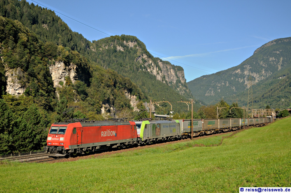 DB 185 109 & BLS 486 507 bringen einen Zug mit Ambrogio-Wechselbrücken durch Faido nach Süden (11.09.2010).