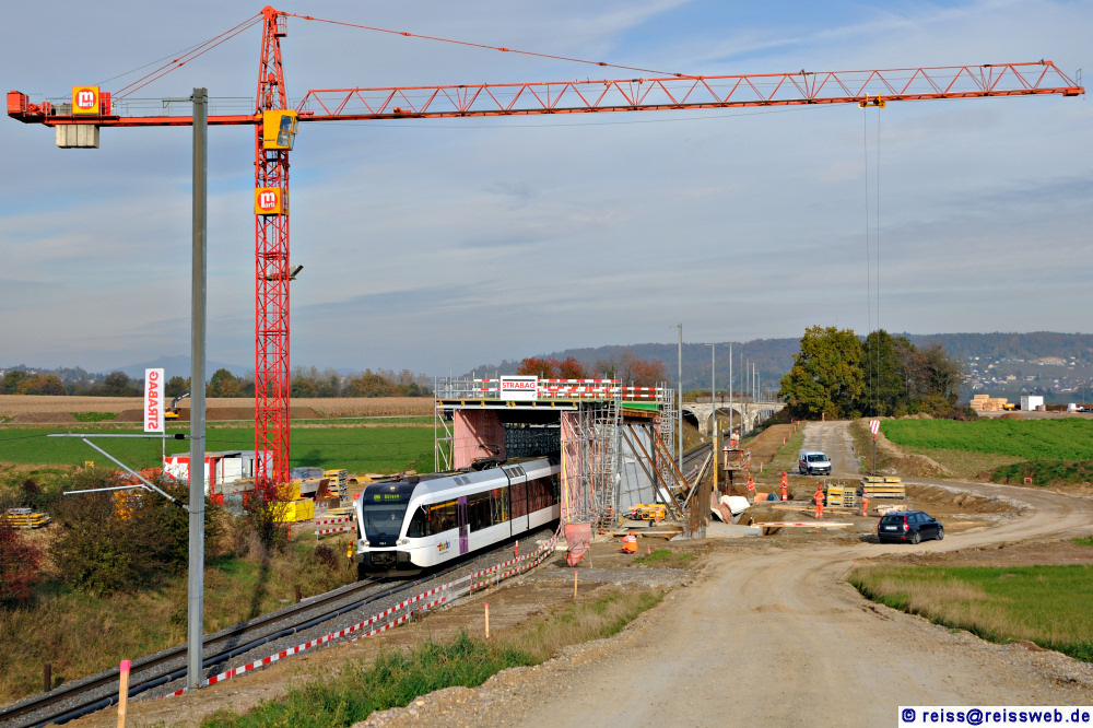 Baubeginn bei der Überführung östlich von Jestetten. Die Bundesstrasse 27 erhält einen neuen Verlauf. Damit kann die Brücke über die künftige Doppelspur in einem stumpferen Winkel gebaut werden (27.10.2010).