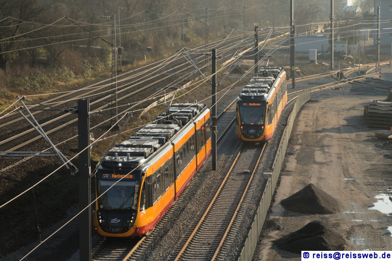 Begegnung der beiden Stadtbahnwagen (links 934, rechts 942) auf der im Vorlaufbetrieb betriebenen Strecke Neckarsulm - Heilbronn zwischen den Haltestellen Kaufland und Hans-Rießer-Straße. Links die DB-Strecke nach Heilbronn Hbf (31.12.2013).