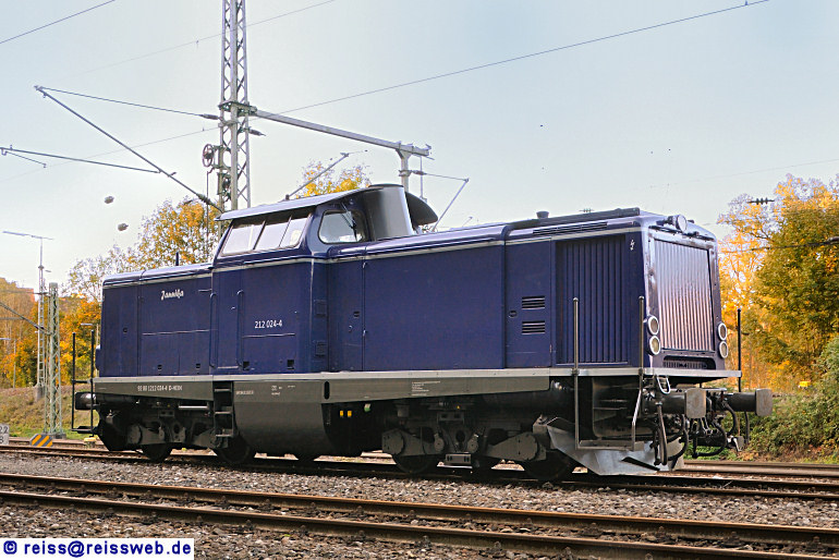 92 80 1212 024-4 D-HEIN wird die Traktion der Aushubzüge zwischen Rottweil und Deißlingen-Lauffen übernehmen. Am Abend des 06.10.2014 steht sie in in einer schattigen Ecke des Bahnhofs Rottweil.