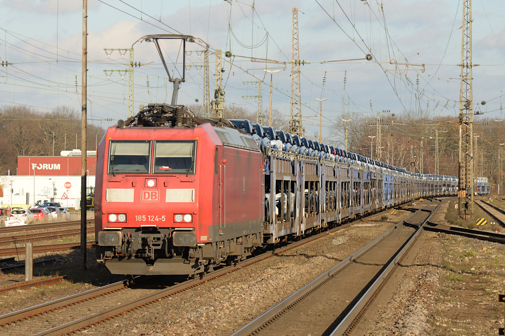 DB Cargo 185 124 führt einen Neuwagenzug durch Rastatt nach Süden (27.11.2025).