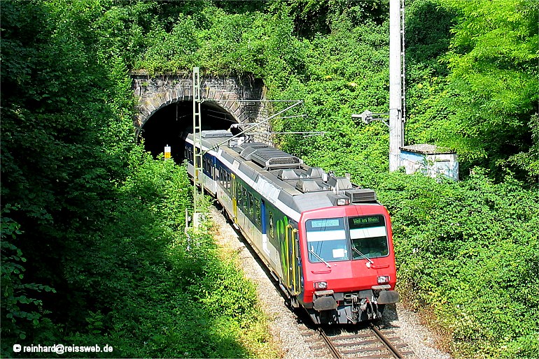 SBB RBDe 561 005 fährt in den Osteingang des Tüllinger Tunnels ein. Beim Bau der Strecke Lörrach - Weil wurde mit diesem Tunnel das Gebiet der Schweiz umfahren (27.06.2003).