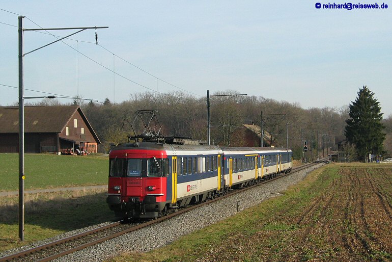 In der nachmittäglichen Februarsonne fährt ein RBe 4/4-Pendelzug auf den Bahnhof Marthalen zu (10.02.2004).