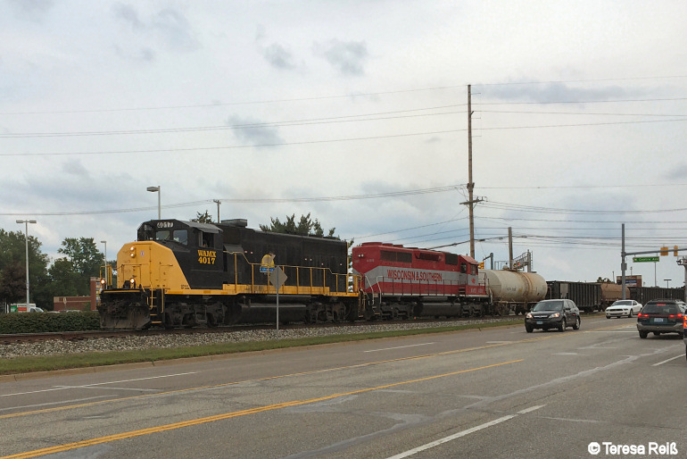Ein Local Freight der Grand Elk Railway erreicht - aus Elkart (IN) kommend - Portage (MI). Es führt WAMX 4017 (eine GP40), WAMX 4189 (eine SD40) ist als 2. Lok eingereiht (Foto: Teresa Reiß, 28.08.2015).