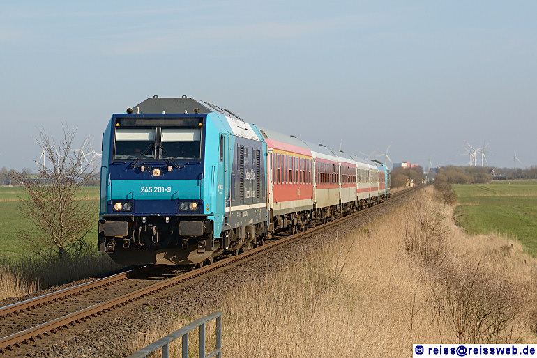 Ersatzzuggarnitur mit diversen Reisezugwagen von DB Regio, DB Autozug und DB Fernverkehr, unterwegs als RE 11018 Hamburg - Westerland. Es führt 245 201, am Zugende befindet sich 245 205 (Niebüll, 27.03.2017).