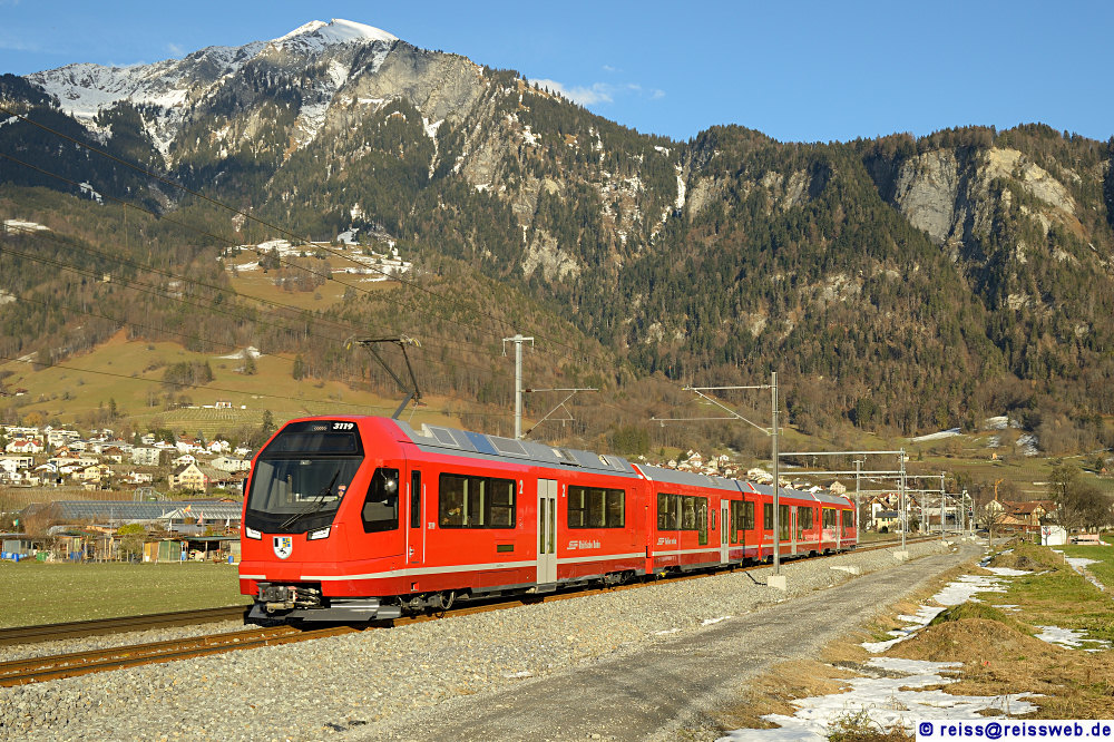 ABe 4/16 3119 "Capricorn" ist als S2 Schiers - Rhäzüns bei Malans unterwegs. Mit 56 Exemplaren wird diese Baureihe einen großen Teil der bisher mit Ge 4/4 II und älterem Wagenmaterial geführten Reisezüge ersetzen (17.12.2020).