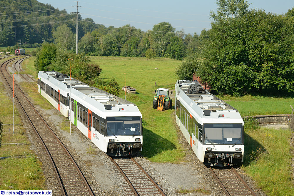 | Die beiden letzen verbliebenen GTW 2/6 der ehemaligen Mittelthurgau-Bahn stehen am 05.09.2021 in Etzwilen. 526 683 (rechts im Bild ) und der Steuerwagen 224 (links vorne) werden als historische Fahrzeuge erhalten bleiben. 526 689 (links hinten) geht auf den Abbruch. |