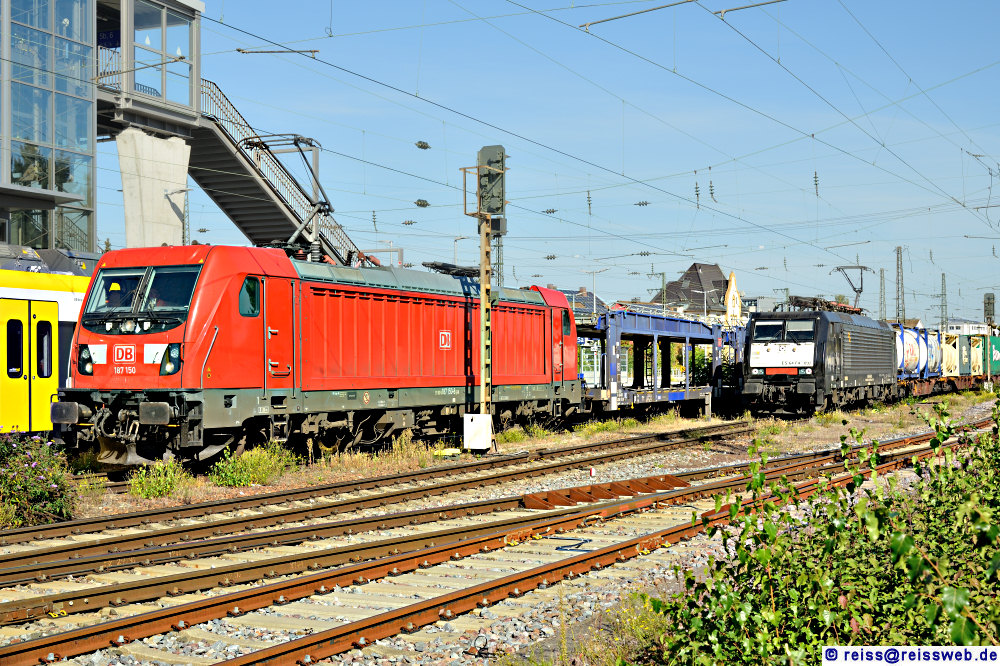 187 150 & 189 992 warten am 12.10.2023 auf ihre Weiterfahrt in den Überholgleisen in Rastatt. Eindrucksvoll ist der Unterschied in der Grünpflege bei einem Bild im