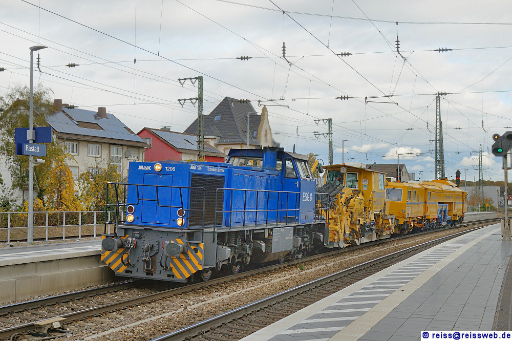 ESG Nr. 8 (1275 108), eine Lok der MaK-Baureihe G1206, gehört der "Eisenbahn-Service Gesellschaft" mit Sitz in Vaihingen/Enz. Am 04.11.2023 bringt sie zwei Gleisbaumaschinen durch Rastatt nach Süden.