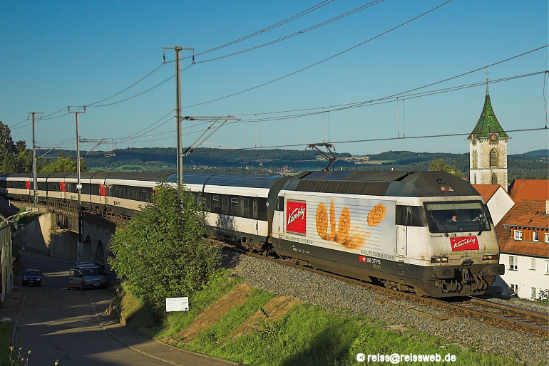 Die Schatten sind Mitte August schon länger, als kurz nach 19:00 Uhr 460 021 "Kambly" mit dem Leerreisezug 26663 das Lottstetter Brückenmotiv passiert (18.08.2006).