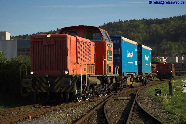 Die Feinverteilung im Industriegebiet Buchs-Dällikon teilen sich Bm 847 960 und Tm 237 876, beide im Besitz der Fa. Stauffer Schienen- u. Spezialfahrzeuge mit Sitz in Schlieren (21.04.2007).