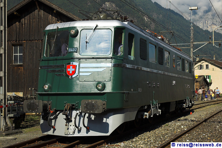 Als historische Lok hat Ae 6/6 11402 "Uri" im Depot Erstfeld wieder eine Zukunft gefunden. Im Rahmen des Gotthard-Jubiläums 2007 war sie im Depotbereich für Führerstandsmitfahrten unterwegs (08.09.2007).