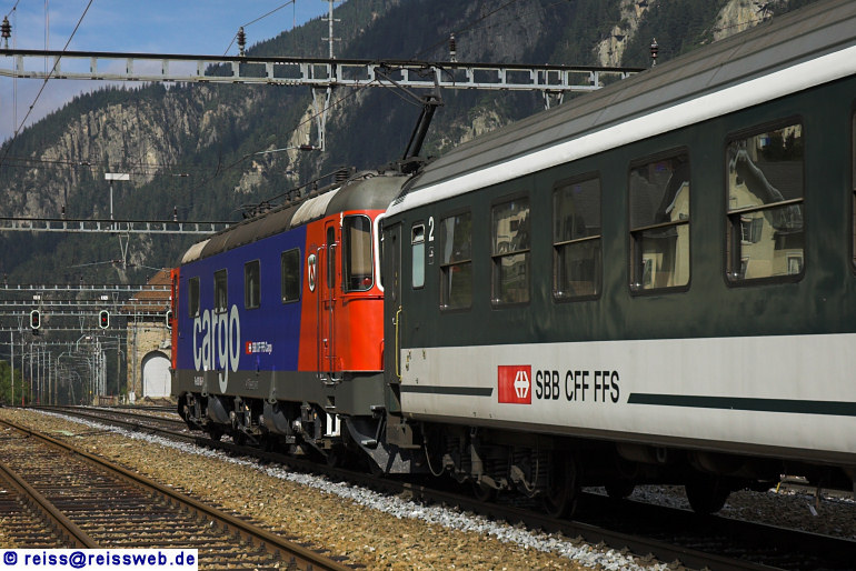 Auch eine Re 6/6 im Cargo-Design war für die Führung der zusätzlichen IR zwischen Arth-Goldau und Biasca eingeteilt, von Göschenen aus geht es jetzt hinunter nach Erstfeld (08.09.2007).