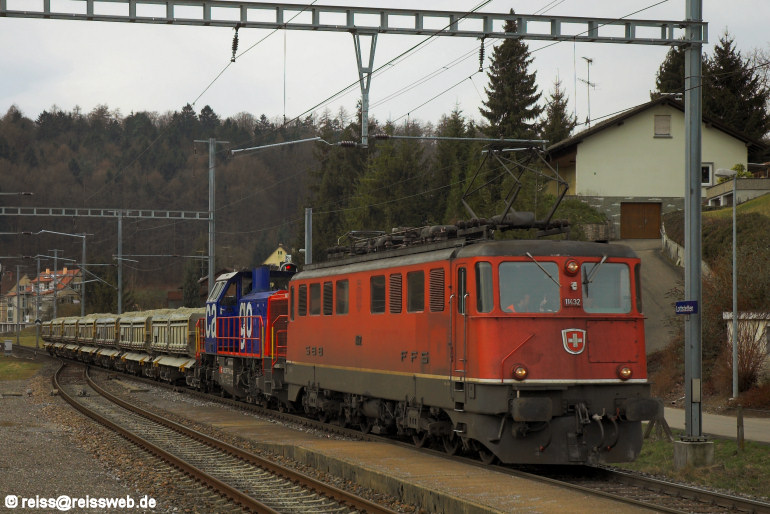 Ae 6/6 11432 u. Am 843 094 sind mit Aushubwagen von Zürich-Oerlikon nach Schaffhausen unterwegs, der Zug hat in Winterthur die Fahrtrichtung gewechselt, daher die Am 843 direkt hinter der Ae 6/6 (Lottsttetten, 07.03.2008).
