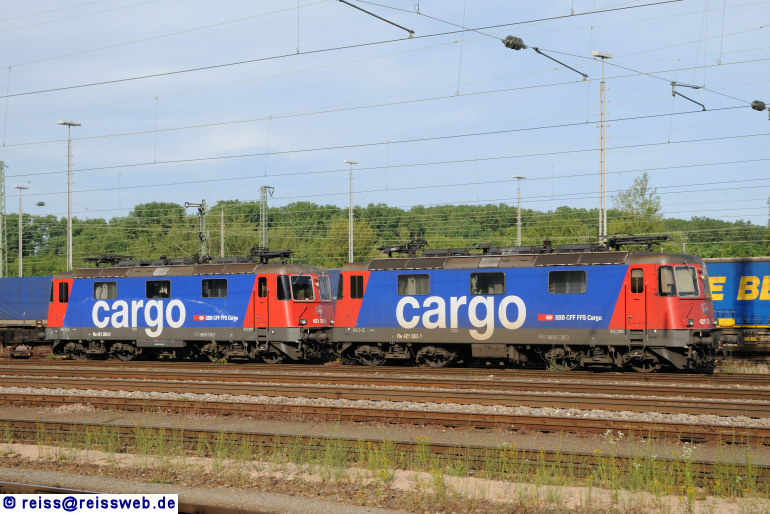 Die SBB übernehmen die Züge der "Rollenden Landstrasse" von Basel Bad Rbf bis ins deutsche Freiburg im Breisgau. Für die Wochenendruhe haben sich 421 383 und 421 393 in ein Abstellgleis im Bahnhof Weil am Rhein zurückgezogen.