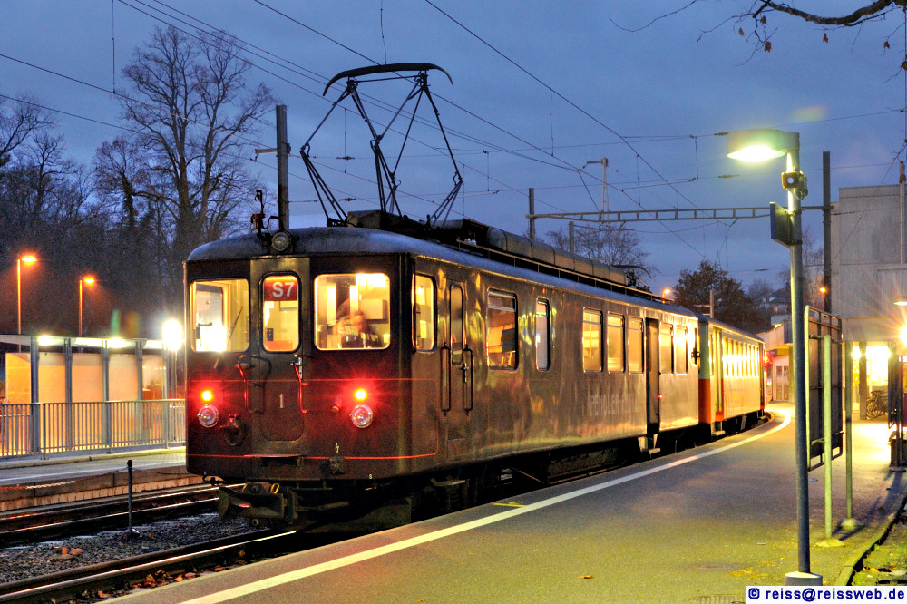 | Letzte Fahrt des Bre 4/4 1 der RBS am Morgen des 11.12.2009 als S7 Bern - Bolligen - Bern. Mit Baujahr 1916 war der Triebwagen eines der ältesten aktiven Triebfahrzeuge in der Schweiz. In einer Fahrgastumfrage erhielt er den Namen "Pendler-Pintli". Aufnahme bei der Wende in Bolligen. |