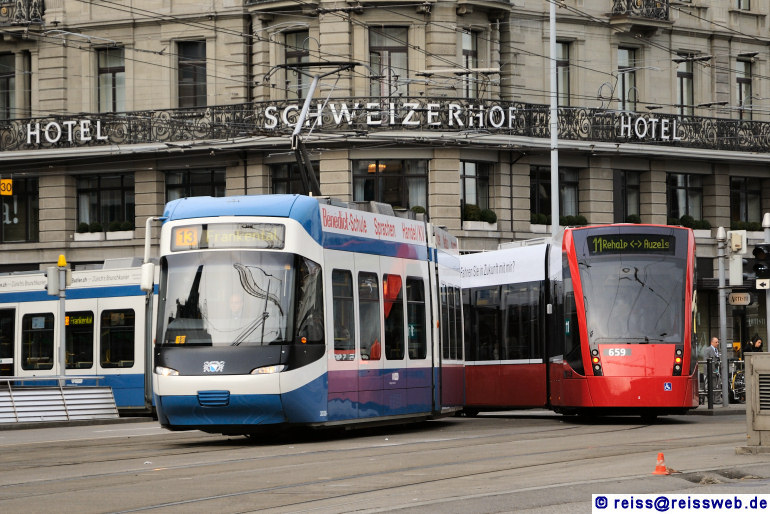 Das Berner Combino Nr. 659 überquert den Bahnhofsplatz, ihm entgegen kommt Cobra 3038 (Zürich, 19.03.2010).