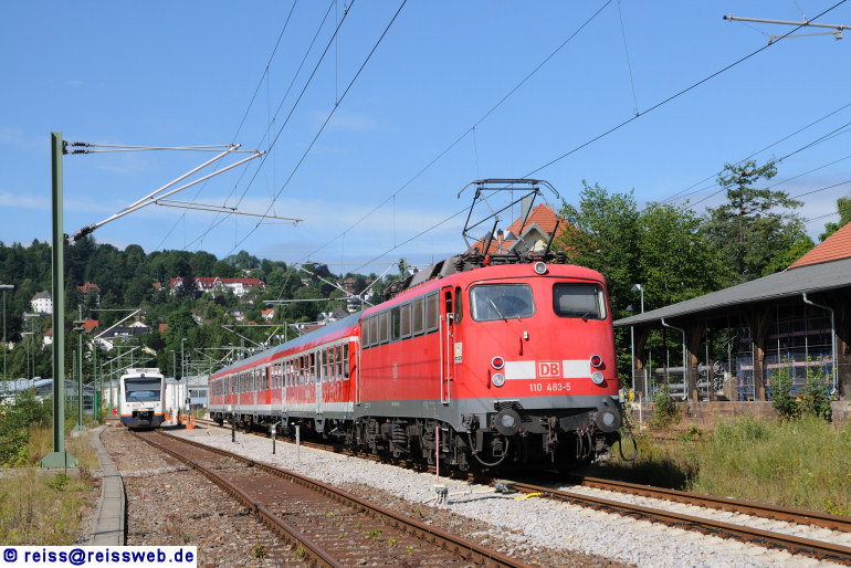 110 483 nach der Ankunft in Freudenstadt Hbf auf dem Gleis, das normalerweise die Ortenau-S-Bahn aus Hausach benutzt. Für die RS1 der OSB wurde daher die "Einfahrt auf besetztes Gleis" per schriftlichem Befehl angeordnet (01.08.2010).