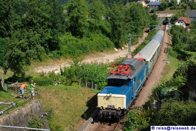 | Weil beide Dampfloks der Ettlinger UEF-Sektion nicht zur Verfügung standen, kam für den Sonderzug "Murgtaldampf" die kürzlich restaurierte 194 178-0 zum Einsatz. Hinter ihr verbirgt sich die ehemalige E 94 580, was auch durch die UIC-Nr. 91 80 6194 580 7 D-RAILU dokumentiert ist (Gausbach, 01.08.2010). |