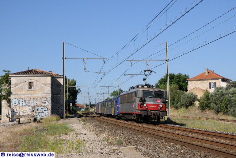 BB 25614 ist am 26.06.2011 mit einer RRR-Einheit zwischen Marseille-St-Charles und Avignon Centre unterwegs. Die Aufnahme entstand in der ehemaligen Station Graveson (zwischen Tarascon und Avignon gelegen).